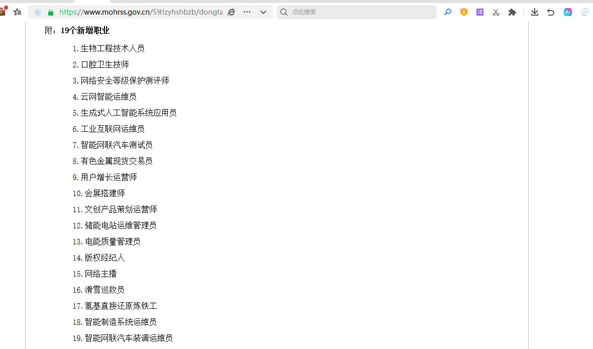 这次发布的19个新职业,半数以上与新质生产力密切相关。如紧跟前沿技术的“数”“智”职业:生成式人工智能系统应用员、智能网联汽车测试员、智能制造系统运维员、工业互联网运维员等;数字经济孕育的全新岗位:网络主播、用户增长运营师等。