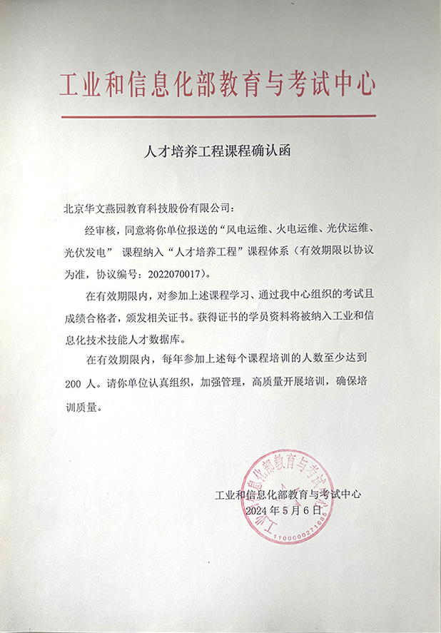 经审核,同意将你单位报送的“火电运维、风电运维、光伏运维、光伏发电”课程纳入“人才培养工程”课程体系(有效期限以协议为准,协议编号:2022070017)。