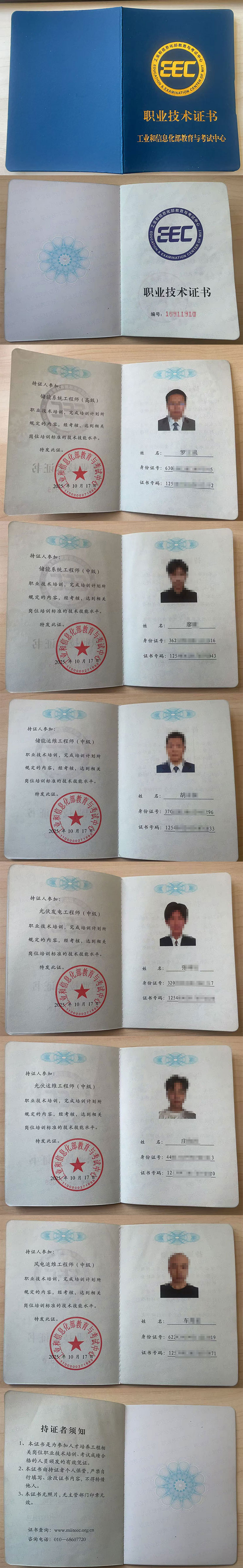 参加2025年9月20号-21号考试批的新能源职业技术人才培训人员,培训考试合格者,经工信部教育与考试中心核准,《风电运维工程师》、《光伏运维工程师》、《光伏发电工程师》、《火电运维工程师》、《储能运维工程师》、《储能系统工程师》职业技术证书已于近日颁发,请各单位注意查收!