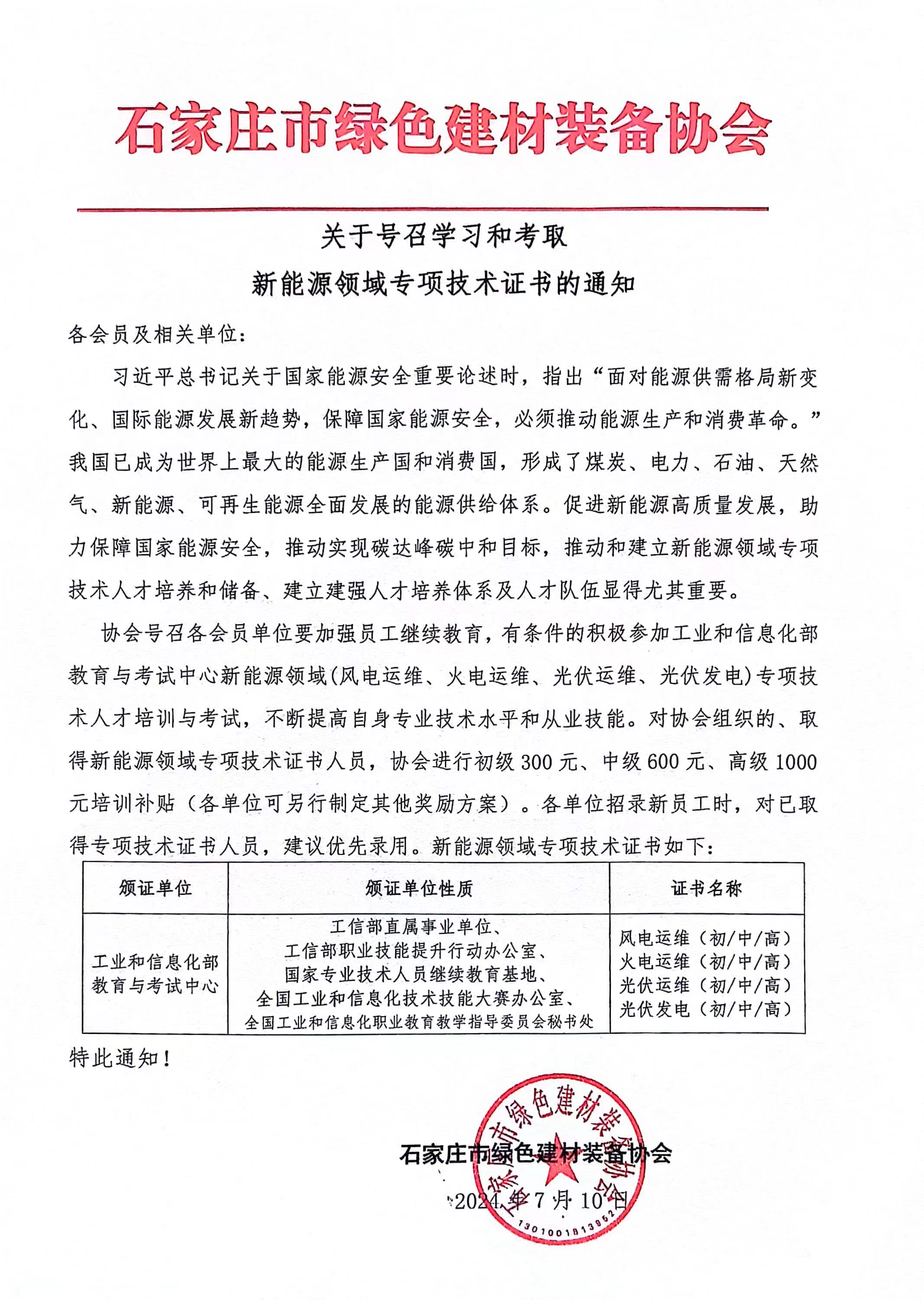 协会号召各会员单位要加强员工继续教育,有条件的积极参加工业和信息化部教育与考试中心新能源领域(风电运维、火电运维、光伏运维、光伏发电)专项技术人才培训与考试,不断提高自身专业技术水平和从业技能。对协会组织的、取得新能源领域专项技术证书人员,协会进行初级300元、中级600元、高级1000元培训补贴(各单位可另行制定其他奖励方案)。各单位招录新员工时,对已取得专项技术证书人员,建议优先录用。
